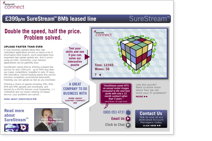 By using the infamous Rubik’s cube to personify a difficult problem solved, we highlighted how Easynet solved that challenge. Miniature Rubik’s cubes were delivered in Direct Mail, online display and microsites featured 3D puzzles customers could solve.